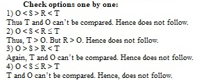 - Which of the following symbols should be placed in the blank spaces respectively to make the expressions T > O, R ≤ O and S < R definitely true?