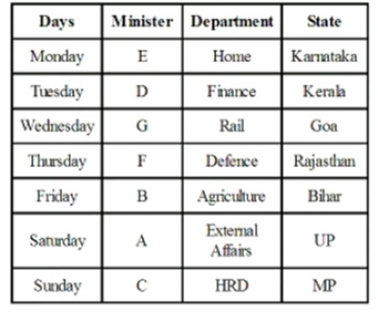 Seven Ministers A, B, C, D, E, F and G who belong to seven different ministries viz— Rail, Defence, Agriculture, Home, Finance, HRD and External Affairs but not necessarily in the same order. Each of them belongs to seven different states viz— Bihar, UP, MP, Rajasthan, karnataka, Kerala and Goa but not necessarily in the same order. They are going to visit Gangtok on different day of the week starting from Monday. F, who is the Defence Minister is going to visit on the fourth day of the week but he does not belong to Bihar or Goa. Only two Ministers are going to visit between Defence Minister and HRD Minister and neither of them is going to visit on the first day of the week. There is only one Minister who is going to visit between Rail Minister and Agriculture Minister. The Agriculture Minister is not going to visit either on first or third day of the week. B is the Agriculture Minister and belongs to Bihar. C belongs to MP and he is going to visit on the last day of the week. The Home Minister is not going to visit on that day either immediately before or immediately after the day on which Rail Minister is going to visit. Neither E nor A is the Rail Minister. D is not the Rail Minister. The Home Minister does not belong to Rajasthan. A is the External Affairs Minister and he is going to visit immediately after the Agriculture Minister. The Finance Minister belongs to Kerala. E is not the Finance Minister. The Rail Minister does not belong to either Karnataka or Rajasthan. The one who belongs to UP is going to visit immediately after the day when the one who belongs to Bihar is going to visit.