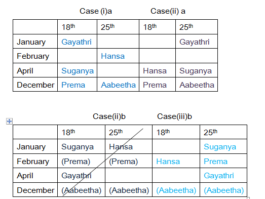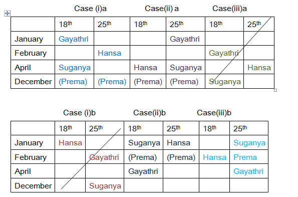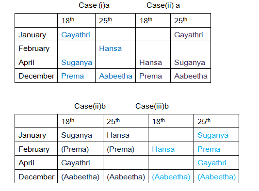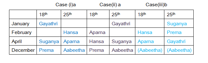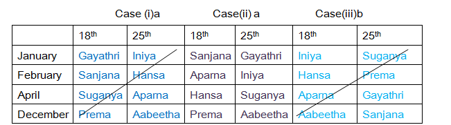 There are eight persons in a group. Aparna, Aabeetha, Iniya, Suganya, Sanjana, Hansa, Gayathri and Prema are working in a company. They all are born in either 18th or 25th of a month. They all have born on four different months namely January, February, April and December in the same year.