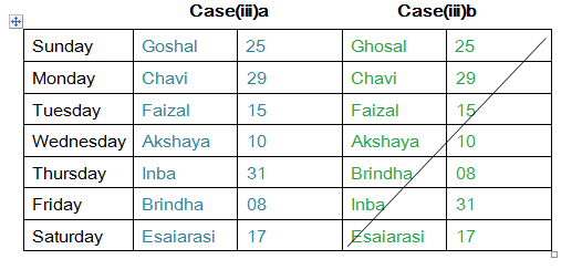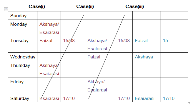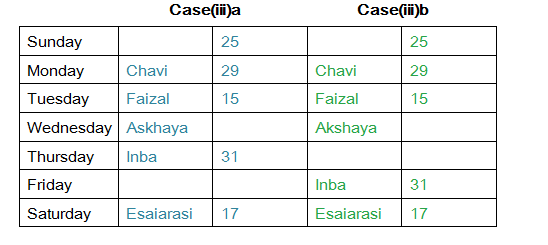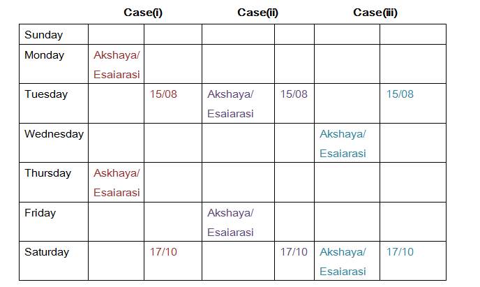 i). Only two persons went to the shopping between Akshaya and Esaiarasi. Neither of them went to the shopping on first day of the week.