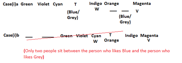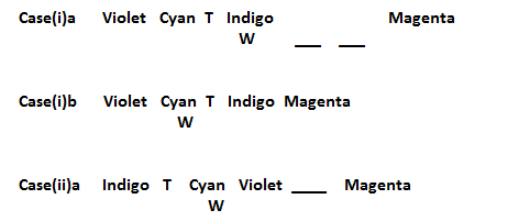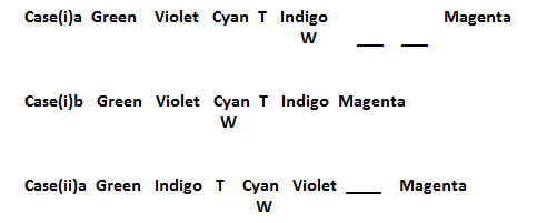 ii). T exactly sits between the person who likes Cyan and Indigo.