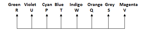 P, Q, R, S, T, U, V and W are the eight people sits in a linear row facing north. They all like different colours namely, Red, Blue, Green, Grey, Violet, Magenta, Cyan and Indigo. But not necessary to be in the same order