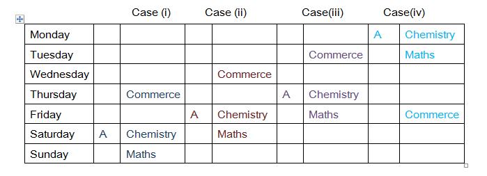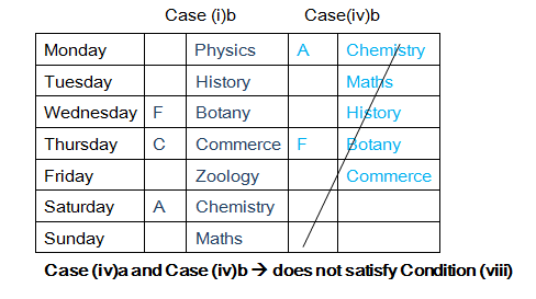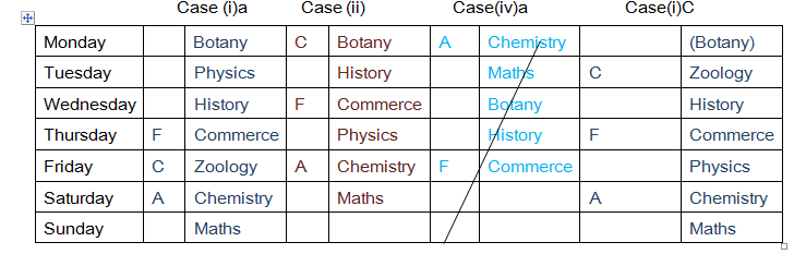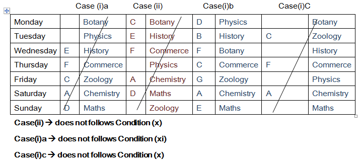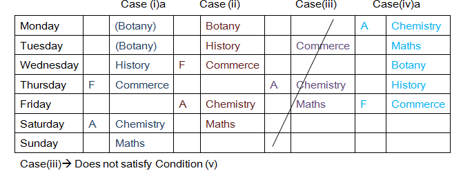 A, B, C,D, E, F and G are the seven persons are like to take seminar in seven different days of the week starting from Monday to Sunday. They all like different subjects like, Maths, Commerce, Botany, Zoology, Physics, Chemistry and History.