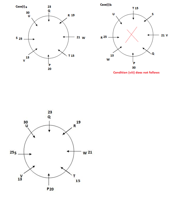P, Q, R, S, T, U, V and W are the eight people sits in circular table faces Centre. They all are in different ages, their ages are 13, 15, 19, 20, 21, 23, 25 and 30 years. P sits second to the right of the person whose age is 25. Only two person sits between the person who age 13 and 21, either one of them sits to the immediate neighbour of the person whose age is 25 years. The person whose age is 21 years sits third to the left of U, whose age is not 13. T sits second to the left of R. S will face W, where W is younger than S. V does not faces, the person whose age is 20. P was younger than Q but not younger than R. The person who faces T will be aged double of T. R was not a 20 years old person. V and Q are not immediate neighbours .
