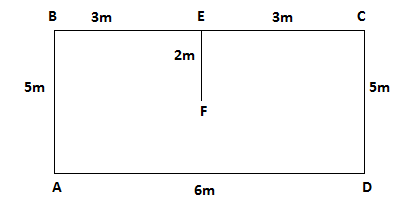 A stands 5 meter south of B, who stands 3 meter west of E. C stands 6 meter east of B. D stands 6 meter east of A. E stands 2 meter north of F.