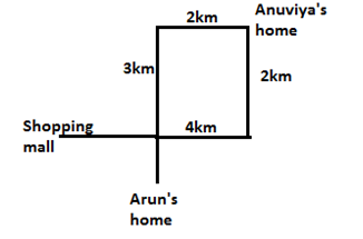 Arun need to go shopping mall from his home. He started walking towards north for 3km and turned right and walked for 2km, then he reached his friend Anuviya’s home. From that place he walked towards south for 2km and turned right and walked for 4km and reached the shopping mall.