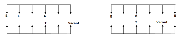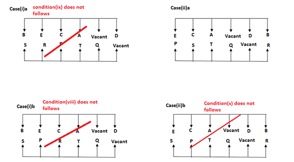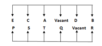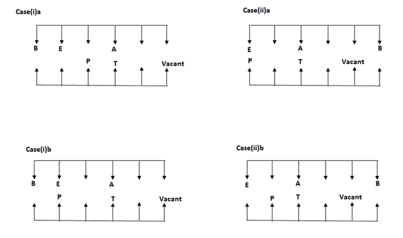 A, B, C, D and E are the five persons facing south, while P, Q, R, S and T are the five persons facing north. But they all not necessary to be in the same order. They all sitting in a six parallel row facing each other. There is one vacant sits in each row.