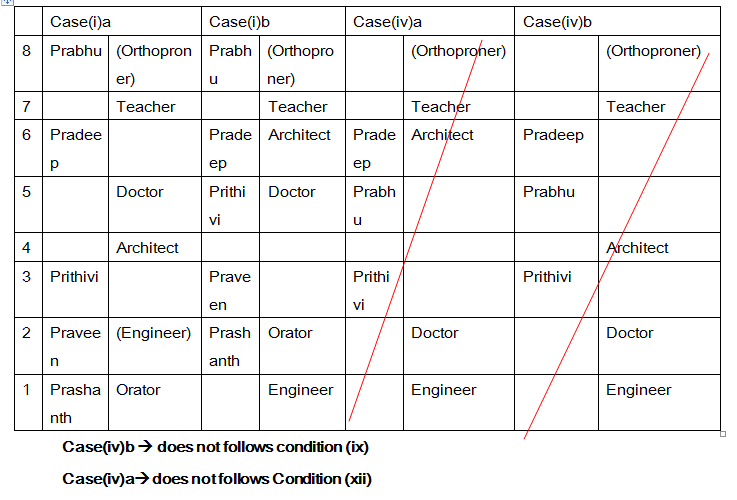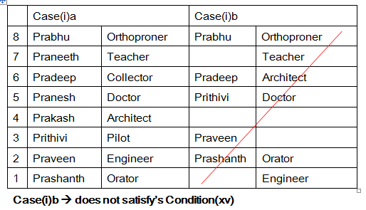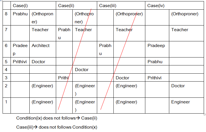 Prakash, Praneeth, Prashanth, Praveen, Pranesh, Prabhu, Prithivi and Pradeep are the eight persons belong to eight different professions namely, Doctor, Engineer, Collector, Architect, Teacher, Orthoproner, Pilot and Orator. The lowermost floor numbers one, its above floor numbered two and so on till top floor numbered eight. They all living in eight different floors but not necessarily in the same order