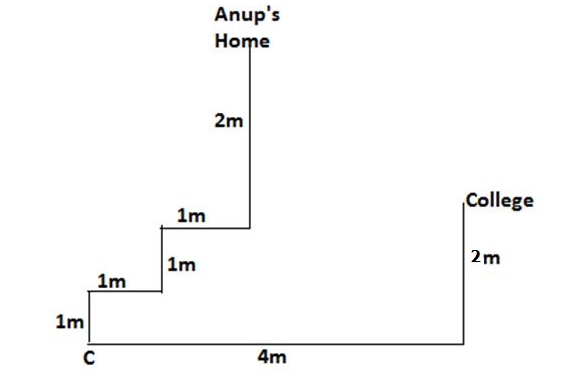 Anup needs to go to College from his home. Anup walked 2 meter south and turned right and walked for 1 meter, then he took two consecutive left and right and walked for 1 meter respectively. Then he turned left and walked for 1meter and reached point C. From Point C he turned left and walked 4 meter and turned left and proceeded walking for 2 meter and reached the college.