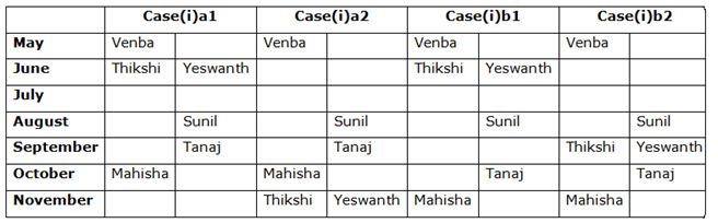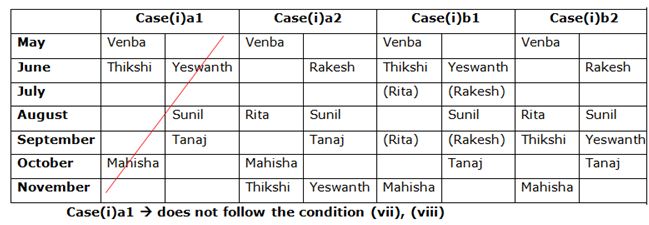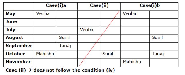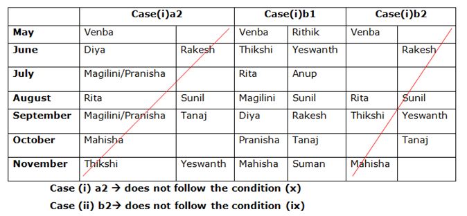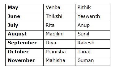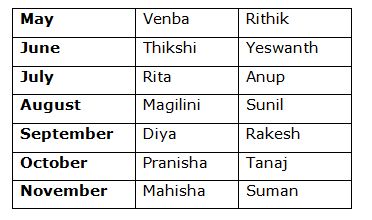 Seven males namely Sunil, Suman, Tanaj, Anup, Yeswanth, Rithik and Rakesh were married to seven females namely Thikshi, Rita, Diya, Pranisha, Mahisha, Venba and Magilini. They all got married in seven different months viz. May, June, July, August, September, October and November of the same year. All the information is not necessary to be in the same order. Not more than one marriage is held in a month.