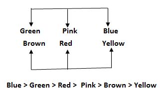 There are six houses in a street, where as the three houses face the other three; such that three faces north and three faces south. They are all in different heights and painted in different colours viz. Red, Blue, Green, Yellow, Brown and Pink.