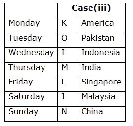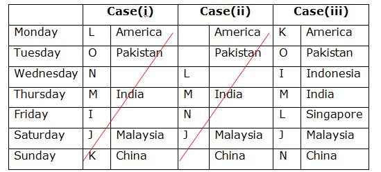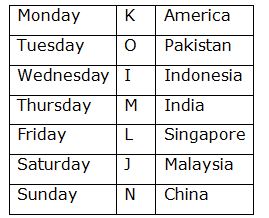 Seven people I, J, K, L, M, N and O are from different countries namely India, America, China, Singapore, Malaysia, Indonesia and Pakistan. They all started their journey in seven different days in a same week and the week days starting from Monday to Sunday. All the given information is not necessary to be in the same order.