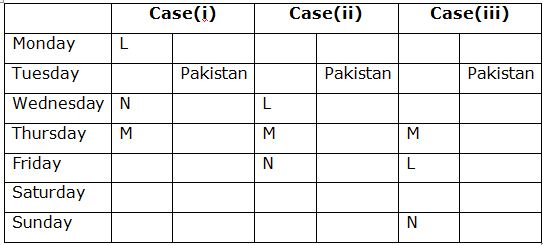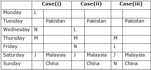The number of people started journey before M is equal to number of people started journey after M. The person J is from Malaysia. The person who started journey on Tuesday is from Pakistan. Only two people started journey between the person who is from America and the person who is from India. Only one person started his journey between N and L. L does not start journey any of the days after N. More than two persons started their journey between the person from Pakistan and the person from Malaysia. The person from China started his Journey one of the days after the person who started his journey from Malaysia. The person from America started his journey neither on Thursday nor on Friday. Only one person started his journey between K and I, who is neither from America nor from China. K is not from China. I neither start his journey before K nor after Friday. The person L is not from Indonesia.