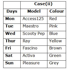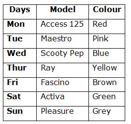 Rahim uses seven different models of bikes namely, Activa, Maestro, Access 125, Fascino, Scooty Pep, Ray and Pleasure in seven different days within a week. All the bikes are in different colours viz., Red, Blue, Green, Pink, Grey, Brown and Yellow. The week days started from Monday to Sunday. All the given information is not necessary in the same order.