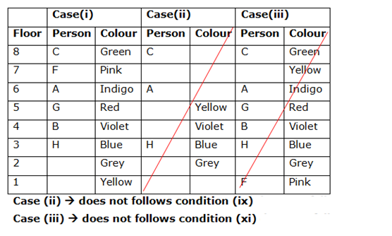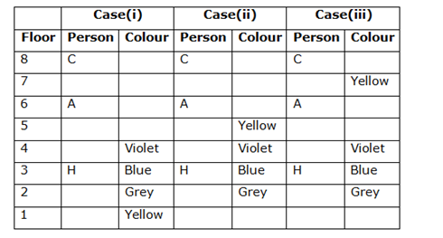 F likes Pink colour. A lives in floor numbered 6. H lives immediately above the person who likes Grey colour. The person who likes Blue colour lives in floor numbered 3. The person who likes Yellow colour lives in an odd numbered floor. H neither lives in a floor above A nor lives in floor numbered 5. Only one person lives between the person who likes Grey colour and the person who likes violet colour. The person who likes Violet colour does not live in odd numbered floor and does not live at any of the floor above the floor numbered 5. Only three people lives between the person who likes Violet and C. Only two person lives between the person who likes Green colour and Red colour. C doesn’t like Red colour. G lives immediately above B, who does not live in an odd numbered floor. D neither likes Grey colour nor lives in floor numbered 7.