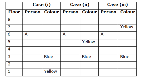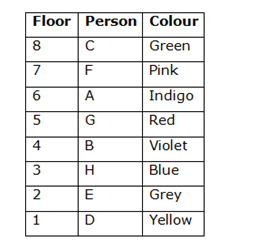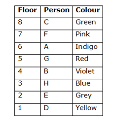 Eight people A, B, C, D, E, F, G and H are living in eight different floors. The lowermost floor is numbered 1 and the floor above 1 is numbered 2 and so on. They all like different colours namely Red, Blue, Green, Pink, Indigo, Violet, Grey and Yellow. All the information is not necessary to be in the same order.
