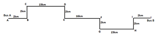 Bus B starts its journey from Point J and moves 2 km to its left to reach Point I. From Point I, it took a left turn and moves 2 km to reach Point H. From Point H, it took a right turn and moves for 15 km and stopped at point G. Point E is located at 16 km left of Point F. Point F is 2 km north of Point G. Point E is located 2 km south of Point D.