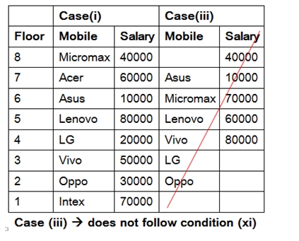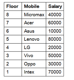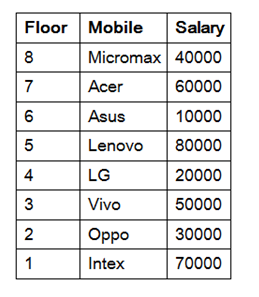 Eight people are living in eight different floors of a building and they have eight different mobiles. The lowermost floor is numbered 1 and the floor above it is numbered 2 and so on. They earn different salaries (in rupees) viz., 10000, 20000, 30000, 40000, 50000, 60000, 70000, 80000. The mobiles were Acer, Asus, LG, Lenovo, Vivo, Oppo, Intex and Micromax. All the given information is not necessary to be in the same order.