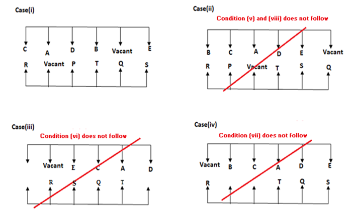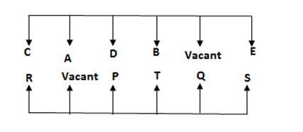 There are twelve seats which are facing each other. In Row I- A, B, C, D and E are sitting and facing south direction. In Row II- P, Q, R, S and T are sitting and facing north direction. Each row contains a vacant seat. No two vacant seats face each other.