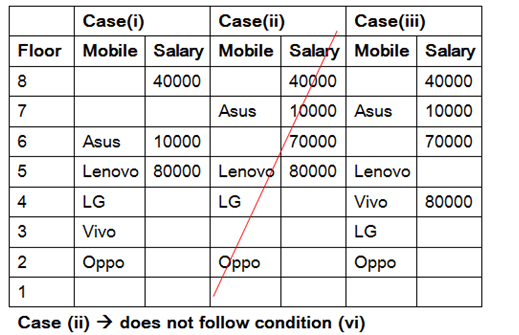 vii). The person who has LG mobile lives in one of the floor below the person who has Asus mobile. The one who has LG mobile lives in the floor immediately below the one who earns the highest salary.
