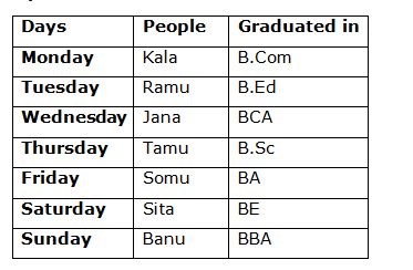 Seven people Jana, Tamu, Somu, Sita, Banu, Ramu and Kala are graduated in seven different streams namely BBA, BE, BCA, BE, B.sc, B.Ed and B.Com. They are all going to tour in seven different days of a week starting from Monday to Sunday. All the given information is not necessary to be in the same order.