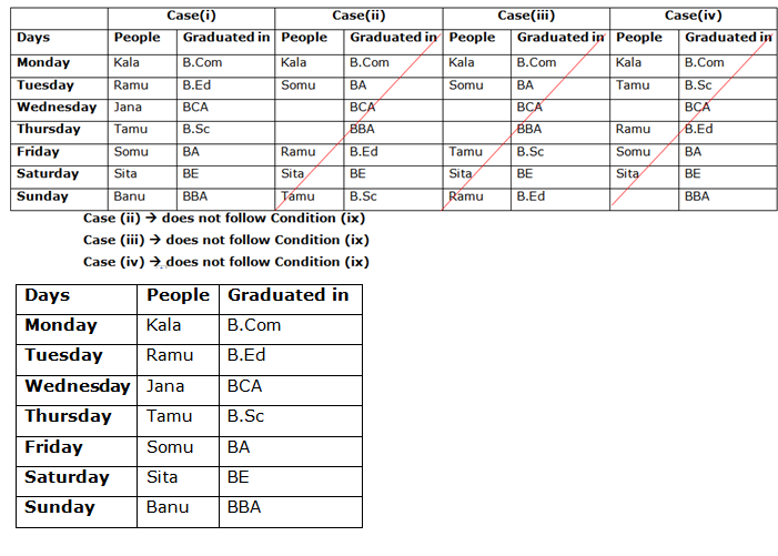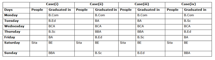 iv). B.Com graduate is going to tour one of the day before BA graduate, who is going to tour one of the day before BBA graduate.