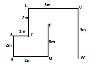 P stands 3 meter north of Q. R stands 2 meter west of Q. T stands 1 meter east of S. R stands 2 meter south of S. V stands 4 meter north of W. T stands 2 meter south of U, who stands 3 meter west of V.