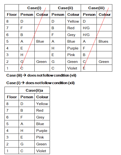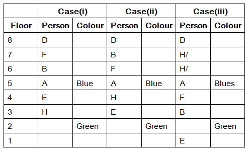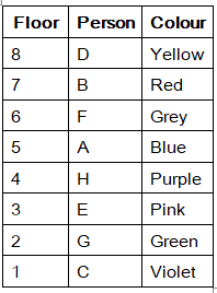 Eight people A, B, C, D, E, F, G and H are living in eight different floors. Each one of them likes different colours namely Red, Blue, Green, Grey, Pink, Purple, Violet and Yellow. All the given information is not necessary to be in the same order.