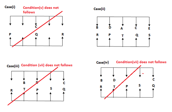 Ten people sitting in two parallel rows facing each other. In Row I: A, B, C, D and E are sitting and they are all facing south. In Row II: P, Q, R, S and T are sitting and they are all facing north. All the information is not necessary to be in the same order.