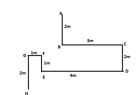A stands 2 meters north of B, who stands 3 meters west of C. D stands 4 meters east of E. H stands 2 meters south of G. F stands 1 meter east of G. D stands 2 meters south of C. F stands 1m north of E.