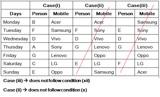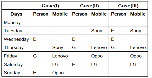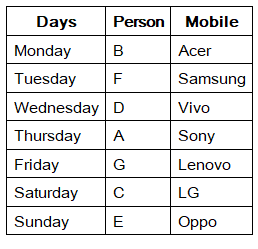 Seven People A, B, C, D, E, F and G are going to shopping in seven different days in the week. Each of them has seven different mobiles namely Sony, Lenovo, LG, Oppo, Vivo, Samsung and Acer. The week days starts from Monday to Sunday. All the given information is not necessary to be in the same order.