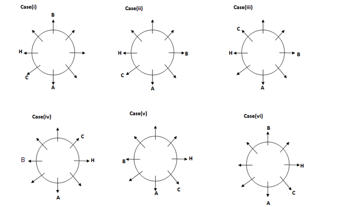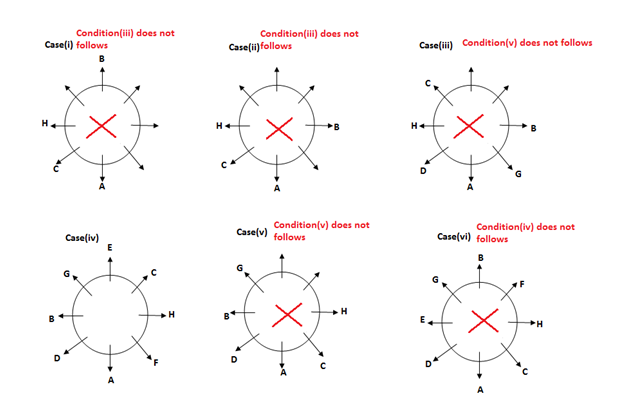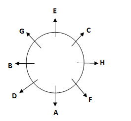 Eight people A, B, C, D, E, F, G and H are the sitting in the circular table all facing outside of the circle, but they all not necessary to be in the same order. Only one people sits between A and H. Only two people sit between B and C, who is an immediate neighbour of H. Only one person sits between G and D, who sits immediate right of A. F sits third to the right of E, who is neither an immediate neighbour of A nor H. A does not sits third to the right of F.