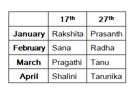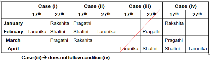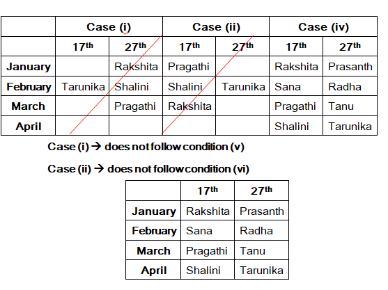 Eight people Pragathi, Prasanth, Rakshitha, Radha, Shalini, Sana, Tarunika are Tanu are born in four different months, namely January, February, March and April. They are born either on 17th or on 27th of the month. But they are not necessary to be in the same order. No two people born on same date.