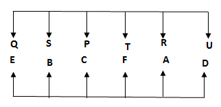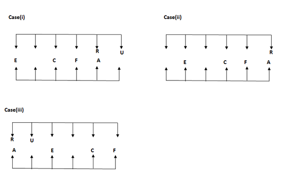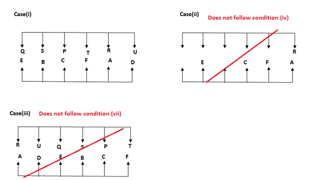 Twelve people are sitting in two parallel rows facing each other. In Row I: A, B, C, D, E and F are facing North, while In Row II: P, Q, R, S, T and U are facing South, but not necessarily to be in the same order.