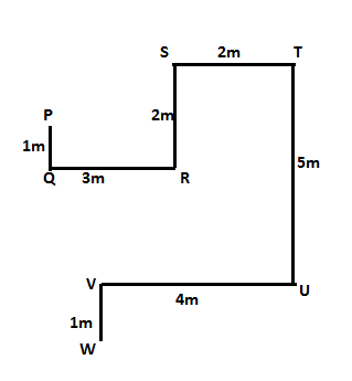 W stands 1m south of V, who stands 4m west of U. P stands 1m north of Q. R stands 2m south of S. Q stands 3m west of R. T stands 5m north of U. S stands 2m west of T.