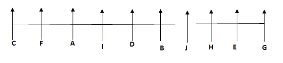Ten people A, B, C, D, E, F, G, H, I and J are sitting in a row all facing north. But they are not necessary to be in the same order. Only three people sits between B and G, either of them sits at extreme end of the line. H sits second to the right of B. Only two people sits between F and D, who is sits immediate left of B. Only one people sits between C and A, who sits immediate left of I. Only one person sits between J and E, who is not an immediate neighbour of B.