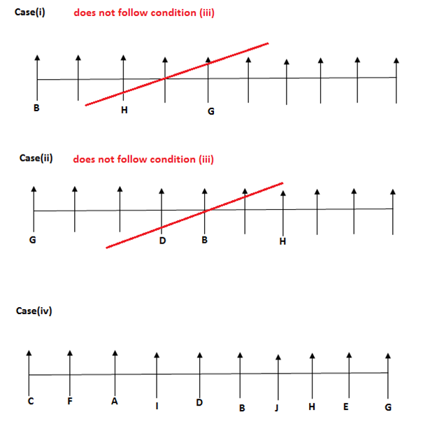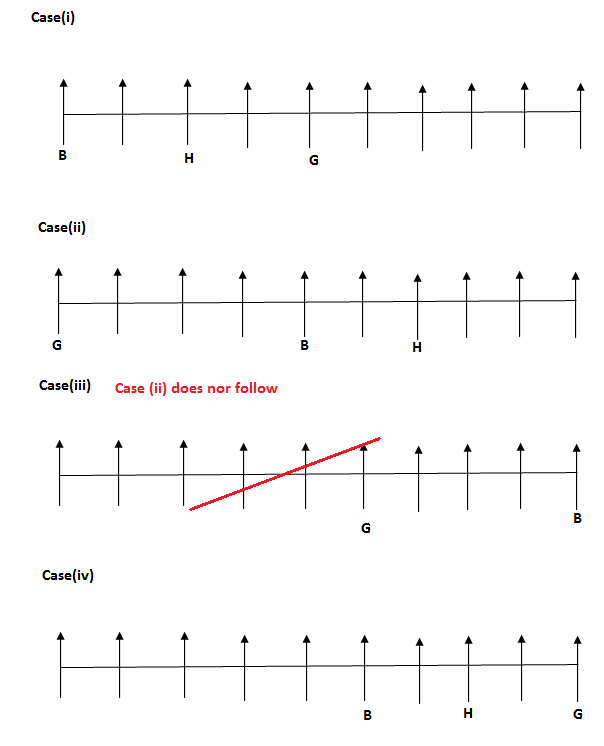 i). Only three people sits between B and G, either of them sits at extreme end of the line.