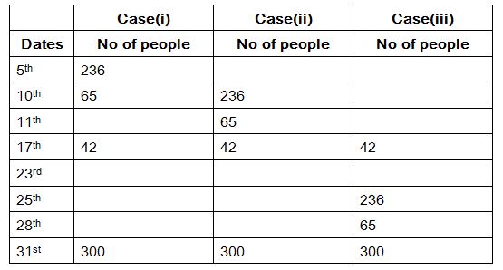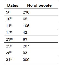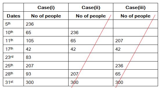 In the month of March different number of people took leave in eight different days, Viz 5th, 10th, 11th, 17th, 23rd, 25th, 28th and 31st of March. The total number of people absent on particular day was namely 42, 65, 83, 93, 105, 207, 236 and 300. But they are not necessary to be in the same order.