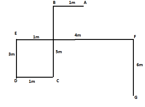 A stands 1m east of B. D stands 1m west of C. C stands 5m south of B. E stands 3m north of D. F stands 6m north of G. F stands 5m east of E.