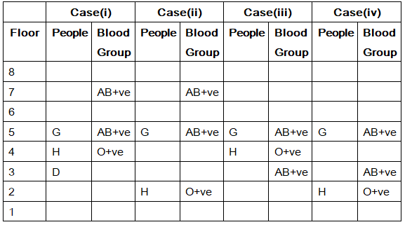 B’s blood group is B+ve blood group. G lives in floor number 5, whose blood group is AB+ve. Only one person lives between the person whose group is AB+ve. D lives immediately below H, whose blood group is O+ve. H lives in even number floor and lives one of the floors below E. B lives in odd numbered floor, who lives one of the floor above H. Only one person lives between C and A. The person whose blood group is B+ve does not live in floor number floor number 7. C and D does not have same blood group. Neither H nor D have same blood group as G. C does not lives any floor below A. F and D have a same blood group. The person who has O+ve does not live in top most floor. F does not live in topmost floor.