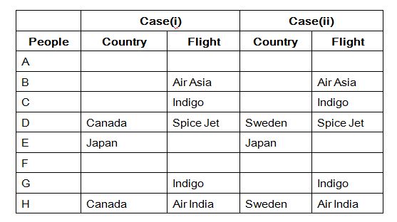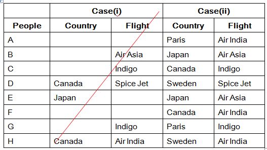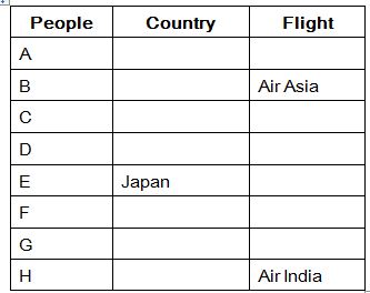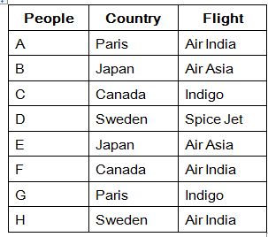 Eight people A, B, C, D, E, F, G and H are going to four different countries through four different company flights. Not more than three and not less than one people are going in a same company flights. The flight companies are namely Air India, Spice jet, Air Asia and Indigo. The countries are namely Paris, Canada, Japan and Sweden. Only two people are going to same places but may travel in different flights. All the information is not necessary to be in the same order.