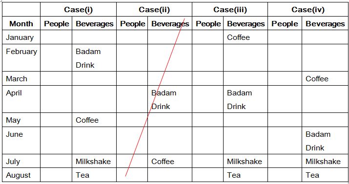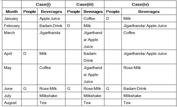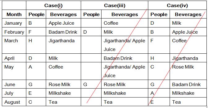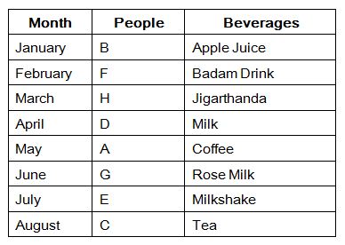 Eight People A, B, C, D, E, F, G and H are born in eight different months in a year. Consider all the people are born in same year. The months are started from January to August. Each of them likes different beverages namely Badam drink, Coffee, Tea, Milkshake, Rose milk, Milk, Jigarthanda and Apple Juice. All the information is not necessary to be in the same order.
