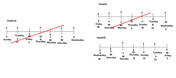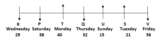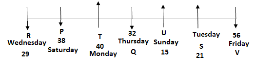 P sits second to the right of Q, who is an immediate left of the youngest person. The Person who takes leave on Wednesday sits at extreme end of the table. The person whose age is 40 is leave on Monday. R sits second to the left of T. R sits at extreme end of the line. Only two people sits between R and the person whose age is 32. The person who takes leave on Tuesday sits second to the left of the person whose age is 32. P’s age is 38 and he takes leave on Saturday, who is not immediate neighbour of the person whose age is 32. The person whose age is 38 sits immediate left of the person whose age is 40, who does not sit second to the right of the person whose age is 32. The person who sits at corner of the table faces same direction. The person who takes leave on Thursday sits third to the left of the person who takes leave on Wednesday. U takes leave on first day of the week, who does not sits at extreme end of the row. U is not elder than S. The person who takes leave on Tuesday was 21 years old. The eldest person of the group is V, who sits second to the right of U. U faces North. V not takes leave on Wednesday. R not takes leave on Friday. Immediate neighbour of R faces same direction of R. U sits immediate left of S. The person who takes leave on Monday does not sit at extreme end of the line.