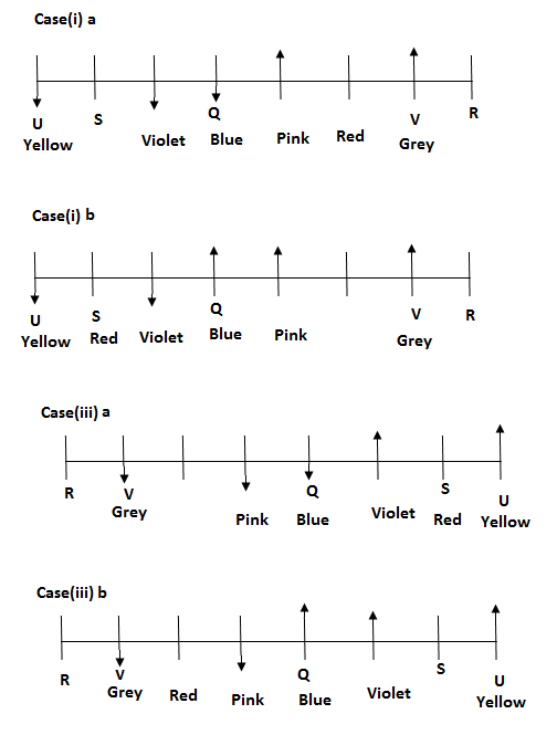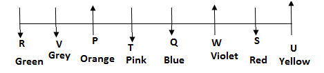 P does not like Pink colour. The person who likes Red colour sits second to the left of Q. Only three people sit between Q and R. The person who likes Grey sits second to the right of the person who likes Pink colour. U likes Yellow colour. The person who likes Violet colour sits second to the left of U. The person who likes Blue colour sits immediate left of the person who likes Violet colour. The person who likes Yellow colour sit at one of the extreme end of the line. S sits immediate right of the person who likes Violet colour. Only two people sits between S and the person who likes Pink colour. T and P are immediate neighbours. R sits third to the right of one who likes Pink colour. The person who likes Blue colour sits immediate left of the person who likes Pink colour. The person who likes Green colour is not an immediate neighbour of the person who likes Pink colour. The person who likes Orange colour does not sits at extreme end of the row. R sits immediate right V. Neither P nor T likes Red colour. P does not faces south. Immediate neighbours of the person who likes Grey colour faces opposite direction.
