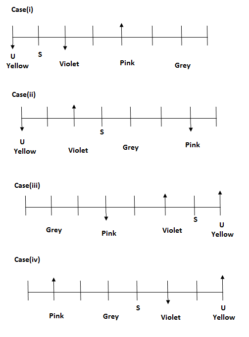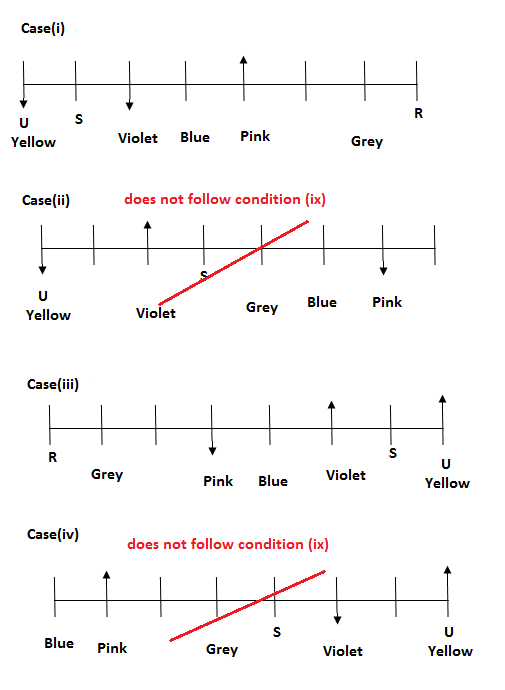 v). Only two people sits between S and the person who likes Pink colour.