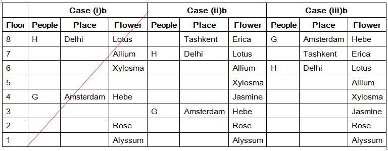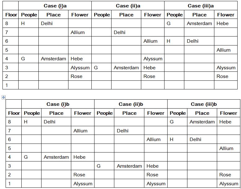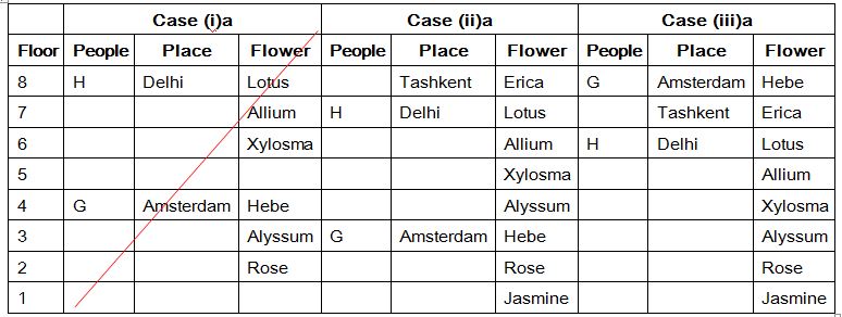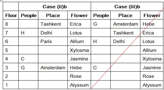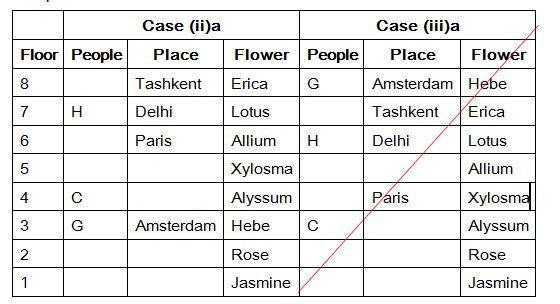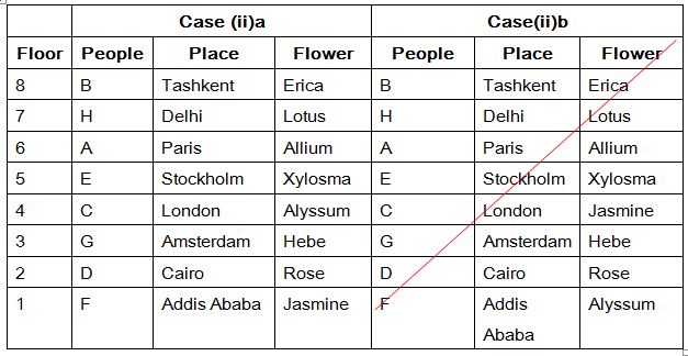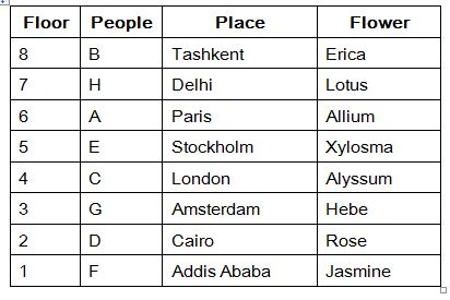 Eight people A, B, C, D, E, F, G and H are from eight different places and they all likes different flowers. They all living in eight different floors in a apartment, The lowermost floor numbered one, its above floor numbered two, and so on till top most floor numbered 8. The places are namely Delhi, Tashkent, Amsterdam, Paris, Addis Ababa, Cairo, Stockholm and London. Each of them likes different flowers namely Rose, Jasmine, Xylosma, Allium, Erica, Lotus, Hebe and Alyssum. All the information is not necessary to be in the same order.