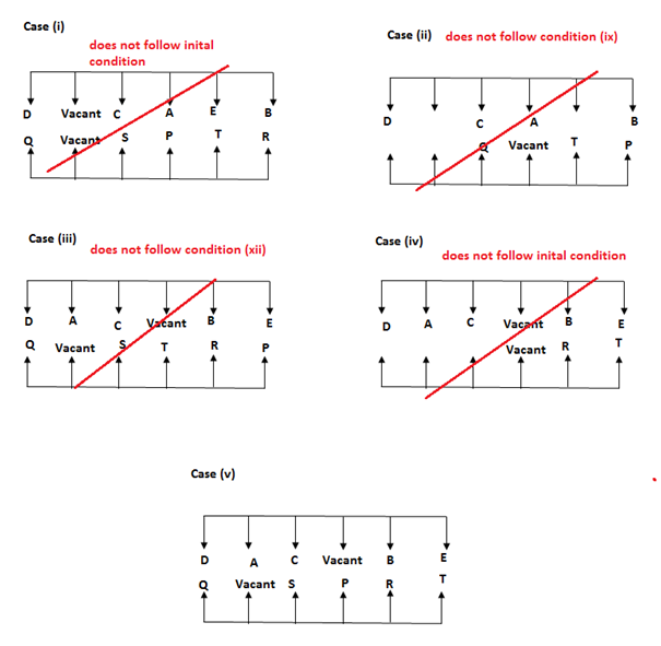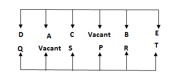 Ten people are sitting in two rows facing each other. In Row I: A, B, C, D and E are facing south. In Row II: P, Q , R, S and T are facing north. There is one vacant seat in each row. Vacant place in each rows does not face each other. All the information is not necessary to be in the same order.