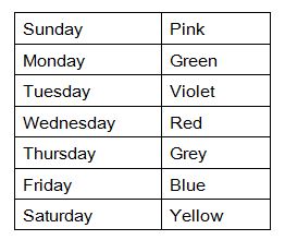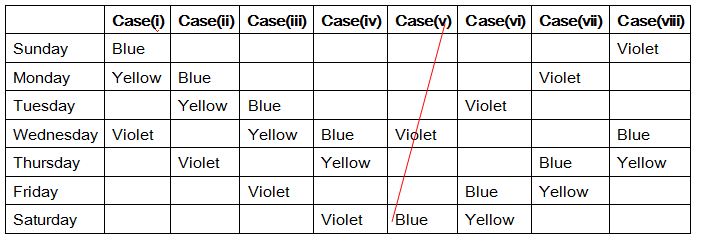 Tabu likes to wear seven different colour dresses in seven different days in a week. The colours are namely Red, Blue, Green, Violet, Grey, Pink and Yellow. The week days are starts from Sunday to Saturday. All the given information is not necessary to be in the same order.