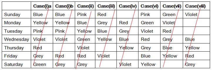 v). Tabu does not like to wear Pink colour dress any day after wearing Red colour dress.