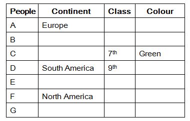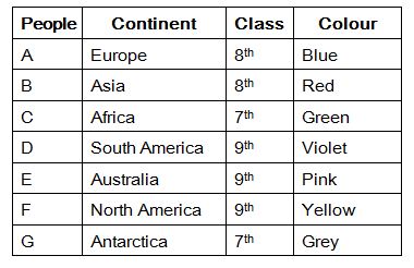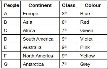 Seven People A, B, C, D, F, G, and H are from seven different continents, namely Asia, Europe, South America, North America, Africa, Australia and Antarctica. They all are studying in three different classes viz, 7th, 8th and 9th. Not less than two people studying same class. They all like different colours namely, Red, Blue, Green, Pink, Yellow, Violet and Grey. All the information is not necessary to be in the same order. Consider the person who is studying 7th is youngest among all and the person who is studying 9th is eldest among the group.